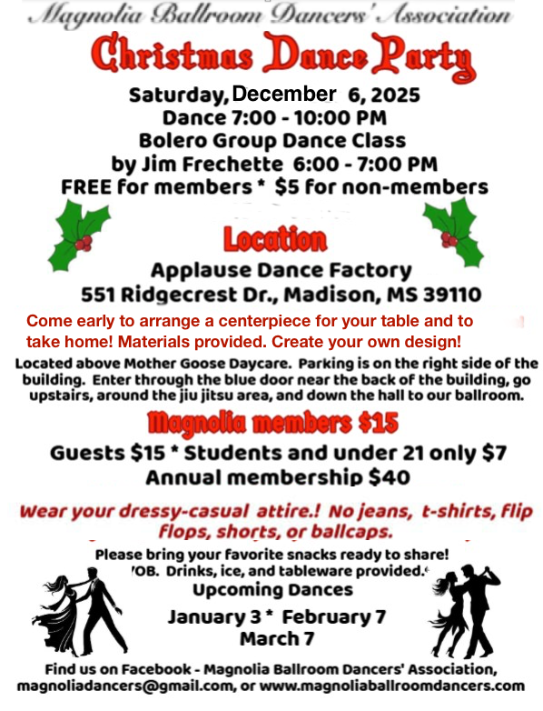 Dances will be held at Applause Dance Factory located at 551 Ridgecrest Dr., Madison, MS 39110